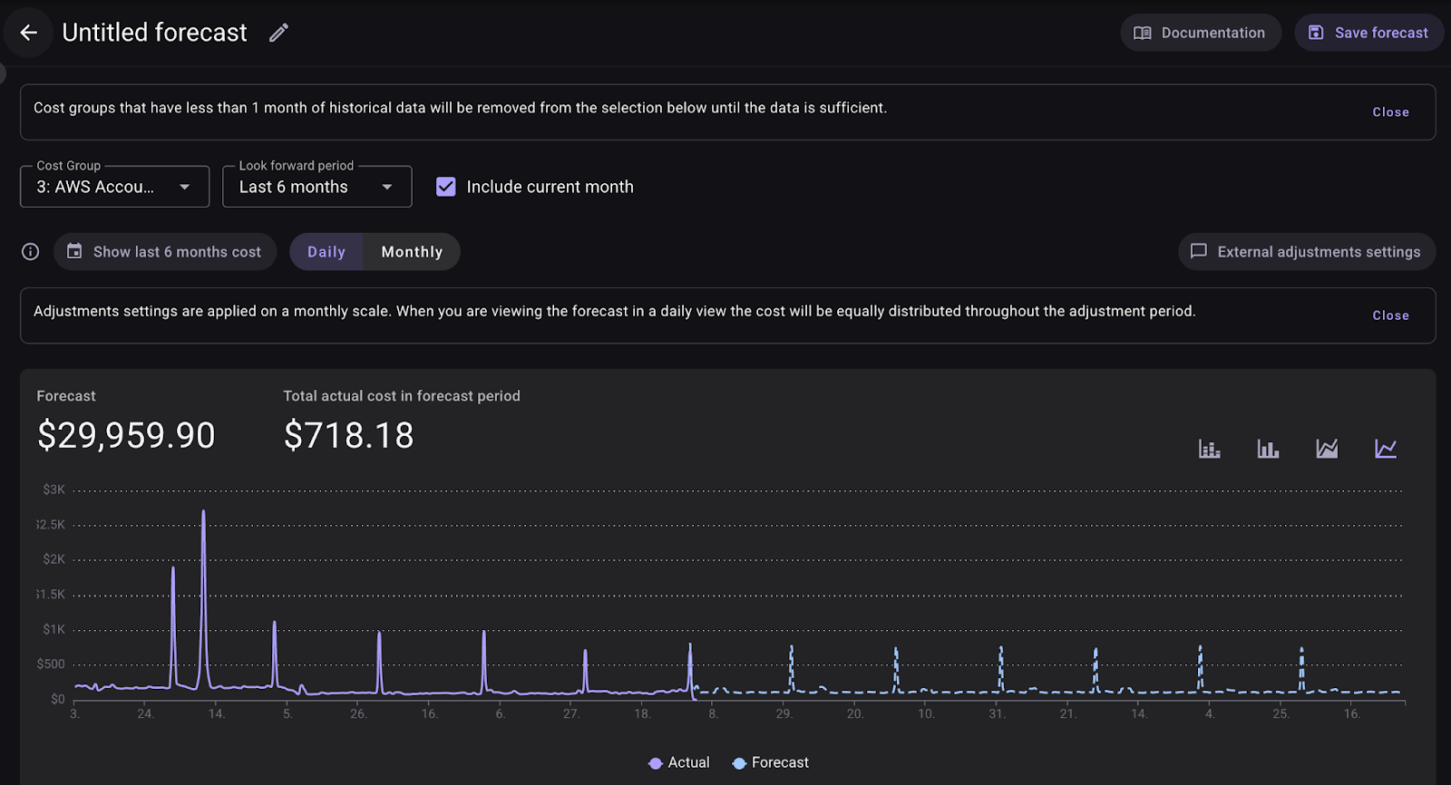 Choose the Cost Group you want to forecast and set your look-forward horizon. Decide whether to include the current month or start fresh from the next full month. You can add an optional view of past cost data and toggle between Daily and Monthly granularity to match your specific use case. The chart and header totals update instantly as you adjust settings, giving you real-time visibility into your projection.